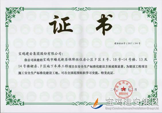2017年11月23日,從中國建筑業(yè)協(xié)會建筑安全分會獲悉,由我公司八項(xiàng)目部承建的寶雞市蟠龍新居保障性住房小區(qū)F區(qū)8號、10號—14號樓、13及14號樓裙房、F區(qū)地下車庫工程在安全生產(chǎn)標(biāo)準(zhǔn)化建設(shè)方面成效顯著,被評選為建設(shè)工程項(xiàng)目施工安全生產(chǎn)標(biāo)準(zhǔn)化工地,可在全國范圍內(nèi)組織學(xué)習(xí)交流。這是繼2016年后我公司第二次榮獲此殊榮。我公司連續(xù)兩年獲此榮譽(yù),為進(jìn)一步提高我公司在建筑行業(yè)的影響力,提升企業(yè)形象,促進(jìn)企業(yè)長遠(yuǎn)發(fā)展奠定了一定的品牌基礎(chǔ)。