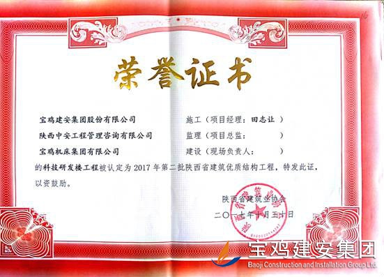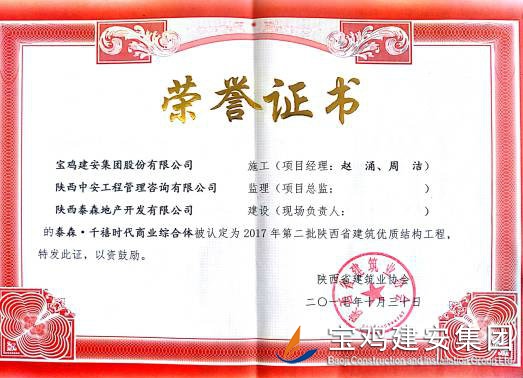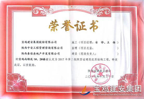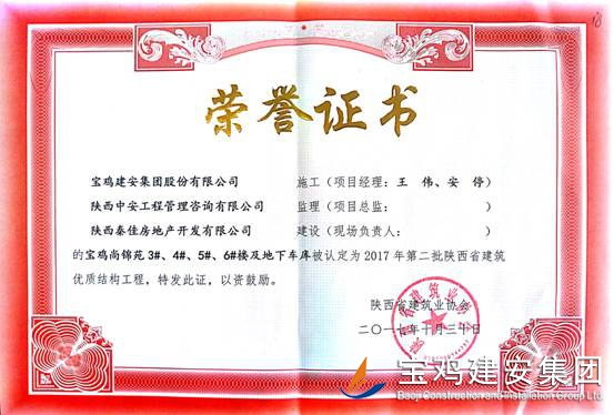 2018年1月26日從陜西省建筑業(yè)協(xié)會傳來喜訊,由寶雞建安集團股份有限公司負責(zé)施工的“科技研發(fā)樓工程”(五項目部)、“泰森?千禧時代商業(yè)綜合體”(六項目部)、“寶雞尚錦苑1#、2#樓”、“寶雞尚錦苑3#、4#、5#、6#樓及地下車庫”及“太白縣城市綜合體項目—酒店及球館工程”(路橋項目部)被陜西省建筑業(yè)協(xié)會評為2017年第二批陜西省優(yōu)質(zhì)結(jié)構(gòu)工程獎。 通過本次獲獎,各項目部能夠依據(jù)項目創(chuàng)優(yōu)要求和相關(guān)法律法規(guī)開展質(zhì)量創(chuàng)優(yōu)工作,對現(xiàn)場原材料、檢驗批、分部、分項工程及功能性設(shè)施進行質(zhì)量管理,做好“三檢”工作,切實履行了質(zhì)量管理職責(zé)。在施工過程中,公司加強對項目實體質(zhì)量和資料的檢查監(jiān)督,推行質(zhì)量標準化,確保了每一項工程都能順利驗收通過。 希望各項目部在2018年應(yīng)夠繼續(xù)加強現(xiàn)場質(zhì)量意識,提升項目質(zhì)量管理水平。質(zhì)量部也將繼續(xù)總結(jié)獲獎工程的典型引路和示范作用經(jīng)驗,強化工程建設(shè)質(zhì)量管理,多出精品,推動公司總體水平穩(wěn)步提高。