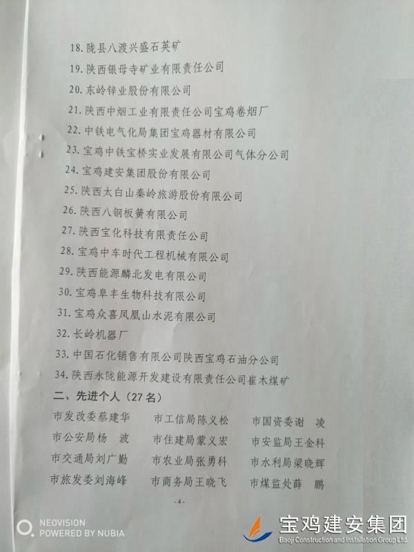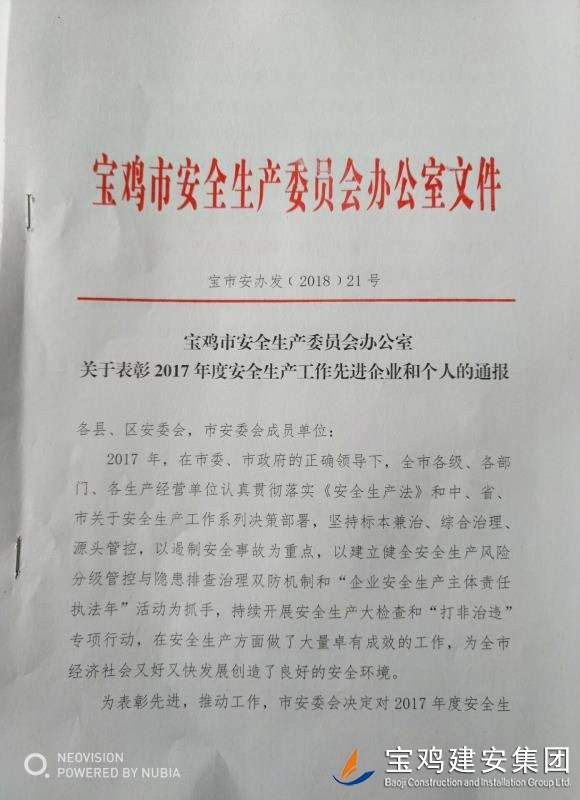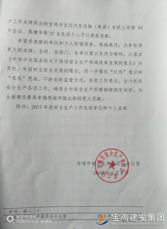 近期,寶雞市安委會對2017年度安全生產(chǎn)先進單位進行了通報,我單位在考核中以優(yōu)異的成績獲得了此項殊榮。當(dāng)然,取得這樣的成績,離不開各級領(lǐng)導(dǎo)的正確決策和基層單位的艱辛付出,公司安委會在此表示感謝。 2017年,公司始終圍繞在國家的大政方針框架下,積極展開以《安全生產(chǎn)法》及相關(guān)規(guī)范標(biāo)準為核心的安全工作,堅持標(biāo)本兼治、綜合治理、源頭管控,以遏制安全事故為重點,建立健全安全生產(chǎn)風(fēng)險分級管控與隱患排查治理雙重機制,持續(xù)開展安全生產(chǎn)專項檢查,杜絕了惡性事故的發(fā)生。在安全生產(chǎn)標(biāo)準化建設(shè)中,公司始終以“科技創(chuàng)新、合理投入、擇善而從”為出發(fā)點進行部署管理,通過系統(tǒng)管理及一系列舉措,使公司安全管理走在本土行業(yè)前列,且在多次檢查驗收中,獲得省、市級領(lǐng)導(dǎo)的點贊。 九牛一毫莫自夸 驕傲自滿必翻車,成績只代表過去,2018年,我們要完善不足,戒驕戒躁,砥礪前行。 寶雞建安集團股份有限公司安委會 2018年4月25日