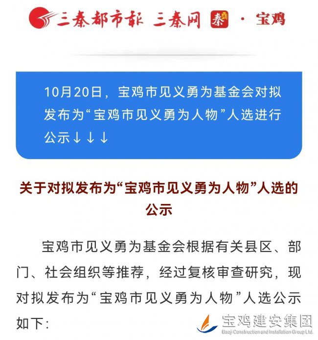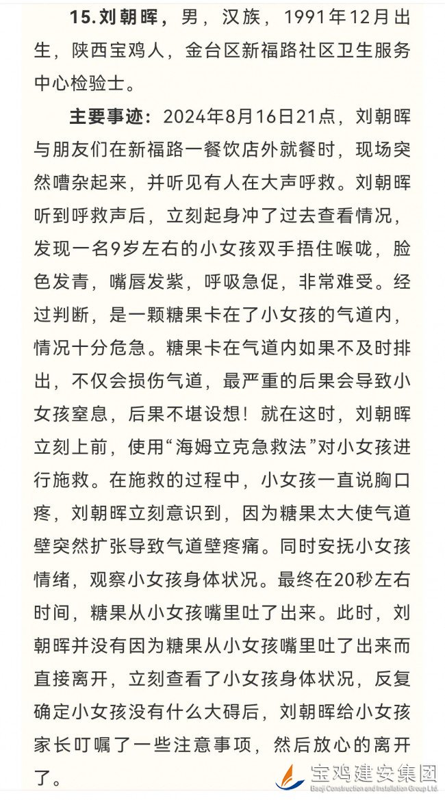 | 日前,寶雞市見義勇為基金會面向全社會對擬發(fā)布為“寶雞市見義勇為人物”人選進(jìn)行了公示,經(jīng)由公司工會推薦上報(bào)的新福路社區(qū)衛(wèi)生服務(wù)中心檢驗(yàn)士劉朝暉同志光榮入選,榜上有名。 此前,劉朝暉同志危急時刻搶救小孩的先進(jìn)事跡經(jīng)網(wǎng)絡(luò)轉(zhuǎn)發(fā)后,《寶雞日報(bào)》等主流媒體亦對其進(jìn)行專訪并公開報(bào)道宣傳,曾引發(fā)社會各界廣泛好評與高度贊譽(yù)。 |