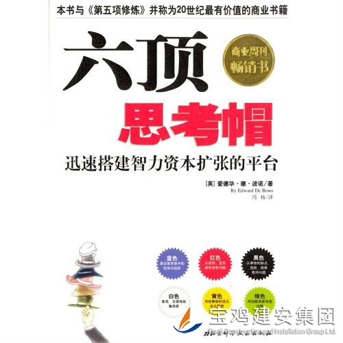 《六頂思考帽》是著名的英國創(chuàng)新思維家愛德華.德.博諾的作品,它通過六種不同顏色詮釋了六種不同的觀點。六頂分別是每個人都認識:藍、白、紅、黃、黑、綠這六種不同的顏色,之所以叫思考帽,是形象地讓人更容易理解和接受,也能夠想象到自己戴上或摘下不同顏色帽子的感受。 藍帽:觀察和管理思考。藍帽負責控制各種思考帽的使用順序,它規(guī)劃和管理整個思考過程,并負責做出結(jié)論。