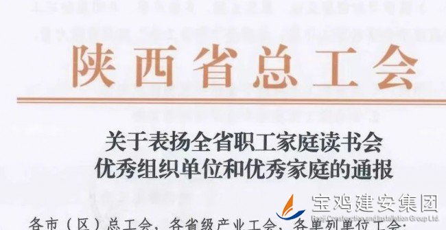 另據(jù)消息,在第28個“世界讀書日”到來之際,由市總工會推薦的全市職工讀書活動兩個代表家庭,被陜西省總工會授予全省優(yōu)秀單位稱號,寶雞建安集團(tuán)工會成為代表全市職工讀書活動中的典型表率之一,受到全省通報嘉獎,為寶雞贏得了榮譽(yù)。