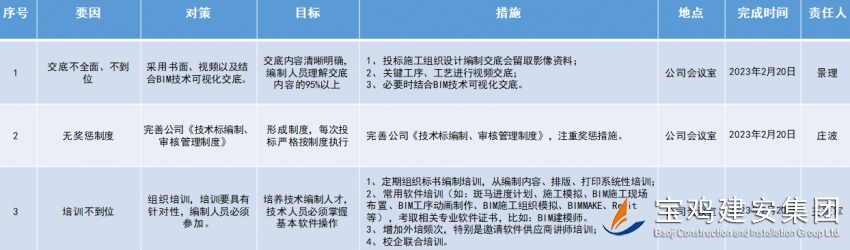 浦賽紅從“5M1E”原因類別入手,即人員、機(jī)器、材料、方法、環(huán)境、測量,收集各種信息、數(shù)據(jù)資料,對分析出來的所有末端原因到現(xiàn)場進(jìn)行測量、試驗(yàn)、調(diào)查分析,找出主要原因,整理分析得出正確結(jié)論,制定滅蚊措施。利用科學(xué)的統(tǒng)計(jì)方法,浦賽紅把這最微不足道的小事,做到了極致,成了“專家”。由此看來,人類從最開始面對事物到逐步認(rèn)識世界和改造世界的過程中,統(tǒng)計(jì)方法起到了重大作用。 在科學(xué)技術(shù)高速發(fā)展的今天,統(tǒng)計(jì)方法在潛移默化中得到了日益廣泛和深入的應(yīng)用。技術(shù)管理過程中應(yīng)用科學(xué)的統(tǒng)計(jì)方法排列圖法,提高投標(biāo)施工組織設(shè)計(jì)審核合格率。見下圖:通過整理近年全公司投標(biāo)施工組織設(shè)計(jì)編寫情況,對投標(biāo)施工組織設(shè)計(jì)審核結(jié)論進(jìn)行分析、統(tǒng)計(jì)、總結(jié)。根據(jù)排列圖分析,影響標(biāo)書審核得分的關(guān)鍵因素是“投標(biāo)施工組織設(shè)計(jì)內(nèi)容針對性不強(qiáng)”,“項(xiàng)目部、分公司投標(biāo)負(fù)責(zé)人或組織人員缺乏系統(tǒng)性部署”其累計(jì)頻率已達(dá)到77.77%,是主要解決的問題。經(jīng)過討論、分析,按照PDCA原則,最后制定了相應(yīng)實(shí)施對策與措施,落實(shí)責(zé)任人和完成時(shí)間,對策表見下圖:學(xué)習(xí)永無止境,在技術(shù)管理方面要不斷掌握和應(yīng)用更多的統(tǒng)計(jì)方法,這樣就有利于更好地解決技術(shù)問題。除此之外,端正工作態(tài)度,提高自身業(yè)務(wù)水平。立足平凡崗位,從點(diǎn)點(diǎn)滴滴日常工作小事做起,腳踏實(shí)地,改變思維,創(chuàng)新工作。從而做到知己知彼,百戰(zhàn)不殆。